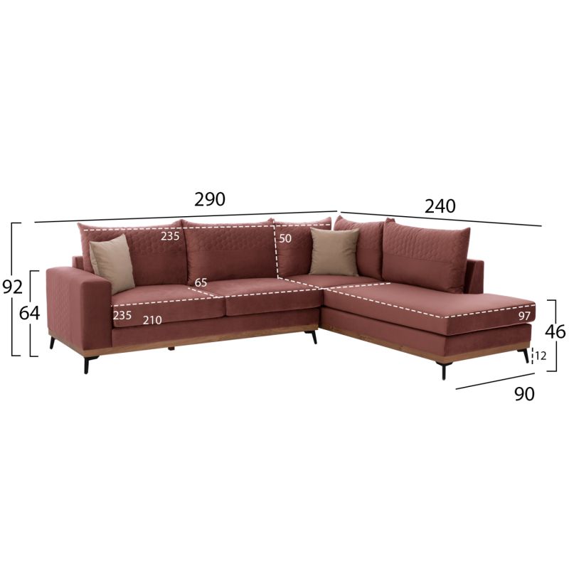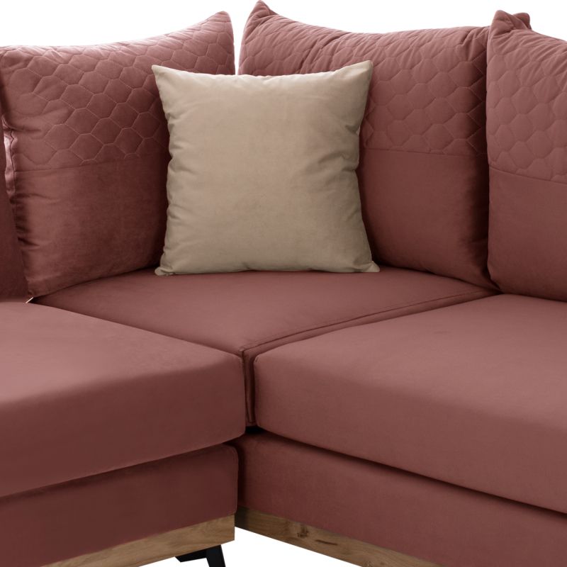 Starting with the basics and the obvious, the color of the velvety upholstery of this large sofa is SAHARA 08- dusty pink. It has 5 backrest cushions in the same color and two smaller decorative cushions in SAHARA 03- ecru. The 4 seat cushions combined with the backrest cushions give the perfect sense of comfort! The backrest cushions have a half-quilted style, and there is also a beautiful, quilted strip on the large arm. The large seat cushion that forms the corner of the sofa sports a Velcro patch underneath it, and sticks to the special surface of the corner stool’s frame. The piece that creates the right corner connects to the rest of the sofa harmoniously with reinforced galvanized panel hangers (vertical drawers) for enormous durability and ease of use.