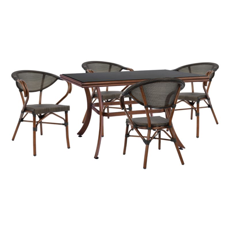 ΗΜ10547—Outdoor dining set with a table with aluminum frame in brown bamboo look and TEMPERED glass surface with black textilene, and 4 aluminum armchairs in brown bamboo look with brown textilene.