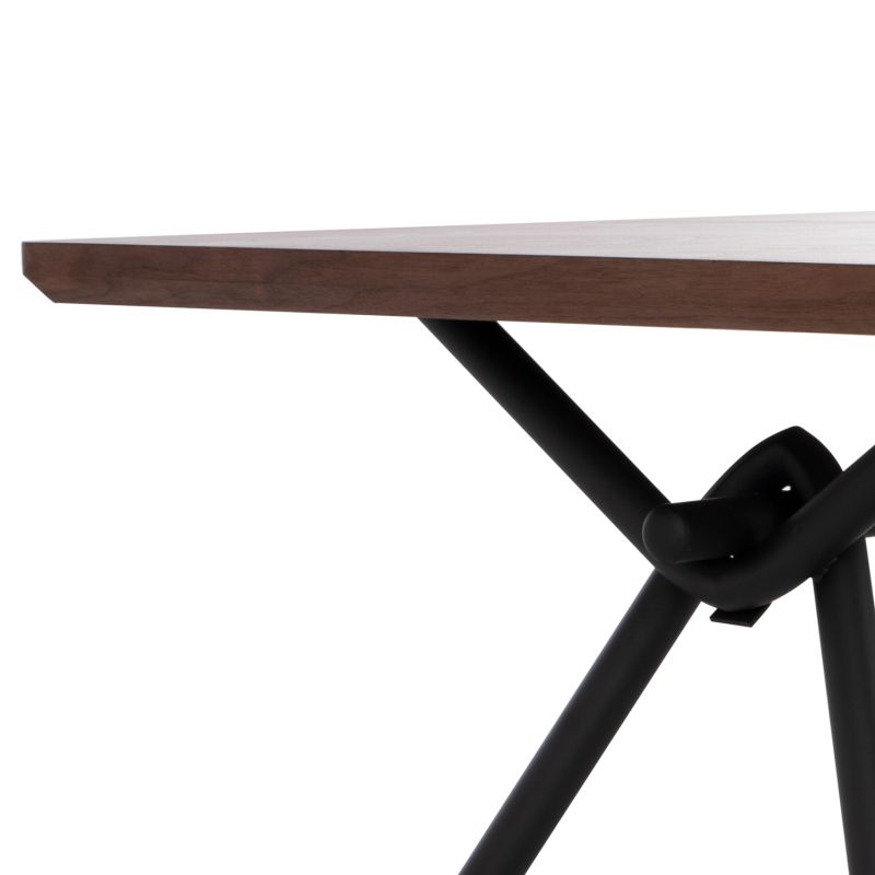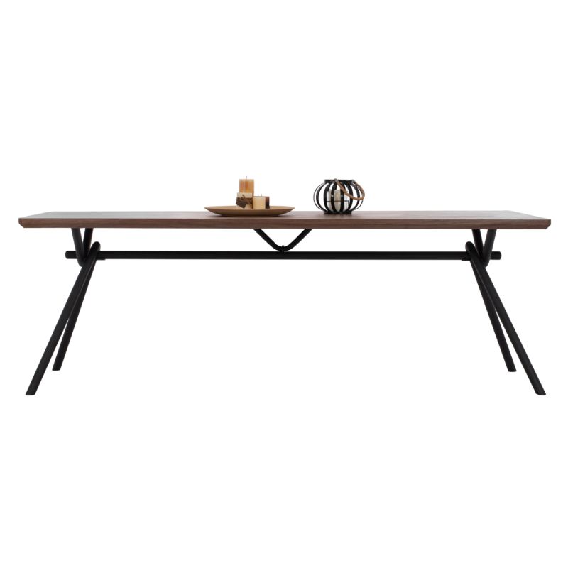 MANDY is a rectangular dining table, with MDF tabletop with walnut wood veneer in dark WALNUT color and rustic style. This surface is slanted and rests on a black metal frame with legs in a slanted Λ shape. It is an imposing table in a large dimension and with a beautiful two-tone color, as a result of which it can fit aesthetically in almost any dining space.