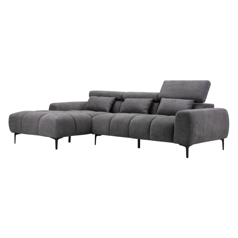 Introducing DIVYA. A brand-new corner sofa (left corner) upholstered in premium synthetic Suede fabric in GREY. The sofa has high metal legs in black and seat with pocket springs in combination with "rich" foam. The comfort it offers is enhanced by the fact that all three headrests at the top of the backrest sport adjustable inclination, while the set is completed by 3 small decorative pillows.