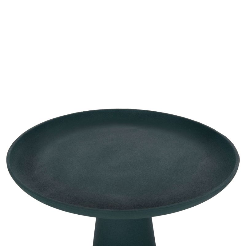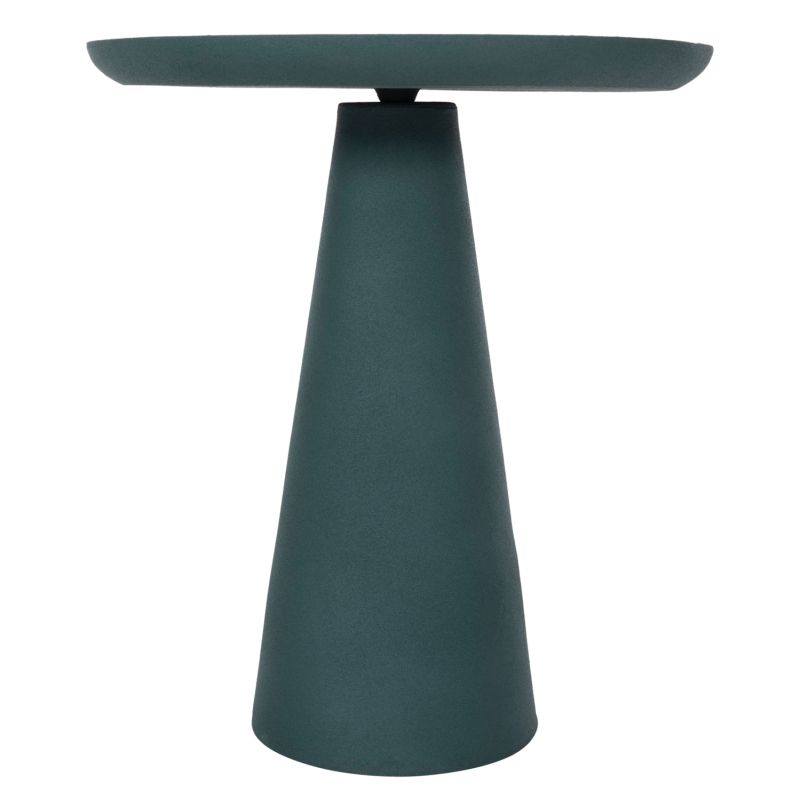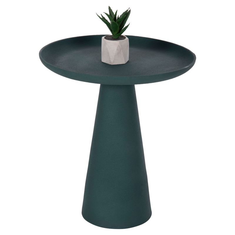 The DELCON side table is one of the new additions to our range. It is a round metallic table with a cone-shaped base. Its color is GREEN throughout. The peculiarity of this table is that the texture of the paint is rough, and that the perimeter of the tabletop is raised giving the impression of a plate. Ideal for both home and business premises.
