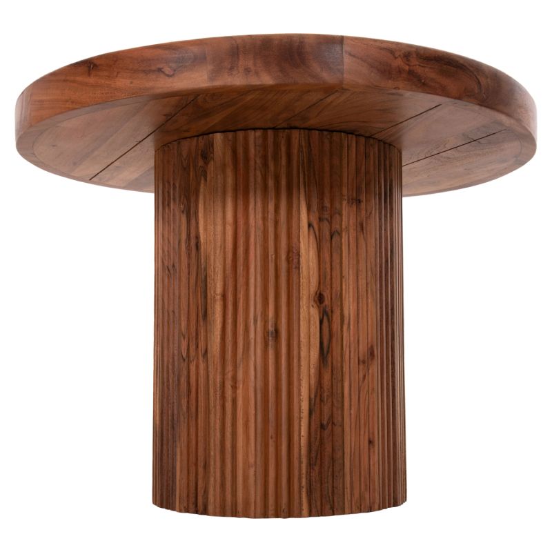 RAJJEH is a round coffee table in natural wood color. The table rests on a wooden central cylindrical pillar. The round tabletop is mounted on this pillar, and it is made of the same quality solid wood. It is a short table with a slightly elevated perimeter of the surface.