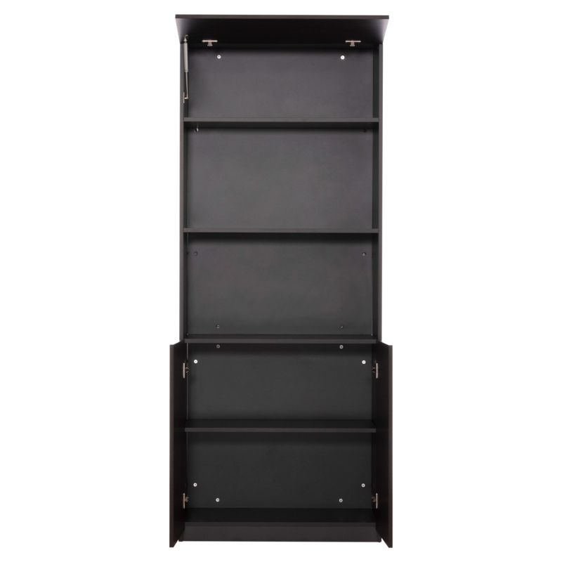 It has three cabinets with inner shelf, one at the top and two at the bottom and three open storage spaces.