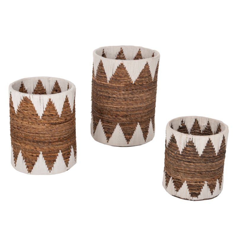 The set of 3 floor baskets HM4307 consists of 3 round baskets in different sizes. Τhey don’t have a lid, and you can use them in various ways. They are made of rush-mat in natural and white color, masterfully woven.