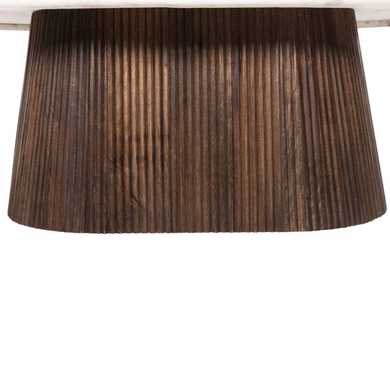 PURGER is a beautiful oval coffee table in satisfactory dimensions with a WHITE MARBLE tabletop. The tabletop rests on a central oval cone-shaped base made of masterfully carved solid wood. This impressive table will aesthetically upgrade your living room while it can match many different styles and colors in the surrounding space.