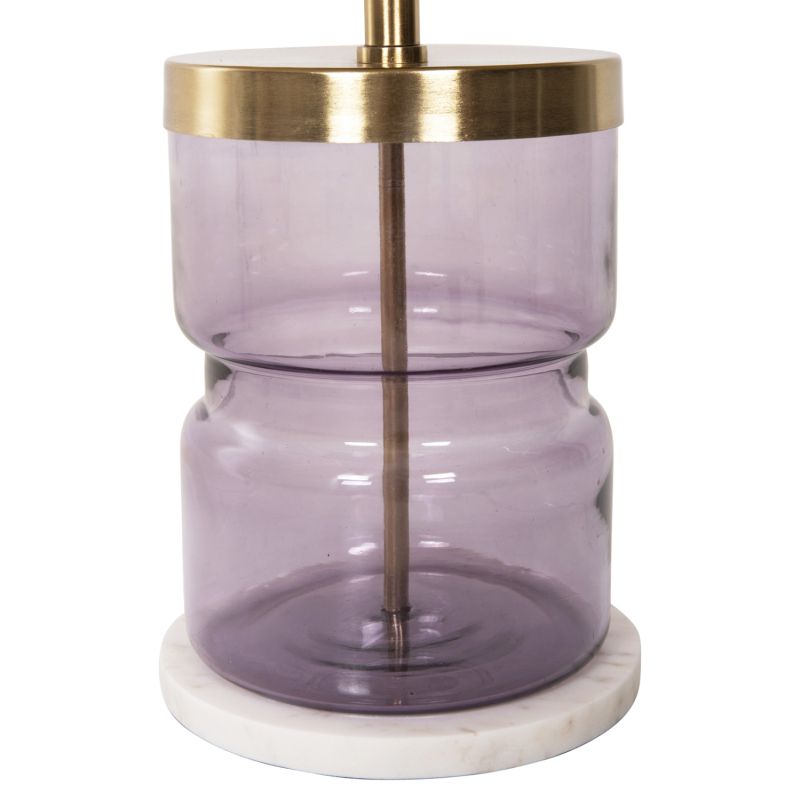 Discover the HAILEY side table. It is a table with a glass cylindrical base in a transparent PURPLE color and a metal "neck" and top in a glossy GOLD color. This side table gives a sense of luxury, and it is ideal for both home and business spaces.