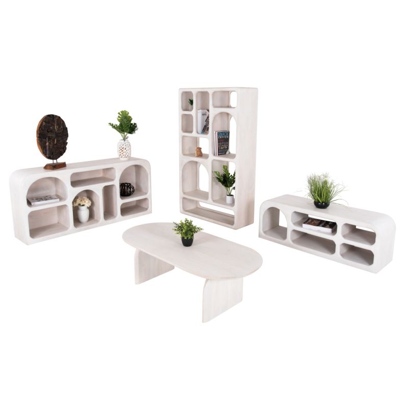 Discover the “HANDYR” living room 4pcs set, made entirely of solid mango wood in WHITE color. It consists of a sideboard (buffet), a bookcase, a TV cabinet, and a coffee table. Design-wise, what characterizes this set are the open storage and placement areas that give uniformity to the space.