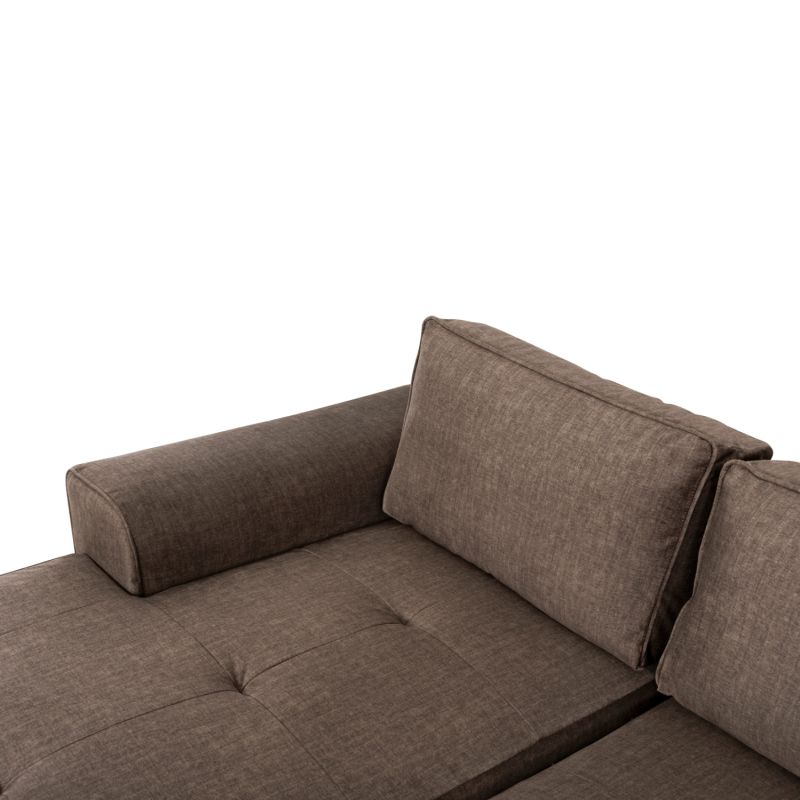 NACHO is a wonderful new 3-seater sofa in a LEFT corner configuration (as you look at it) that will blow your mind. It is very low with silver wide metal legs, which offer sturdiness and proper support. It is upholstered in a beautiful BROWN fabric with a lightly quilted style, the corner piece is connected to the main sofa with vertical panel hangers. It has 3 back cushions, while the seat has medium hardness foam fillings combined with horizontal (zig-zag) springs offering unparalleled comfort. Finally, the arms of the sofa are particularly wide, which gives it sturdiness as well as practicality. And of course, we offer this sofa with a 3-year frame warranty!