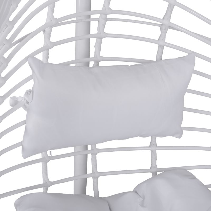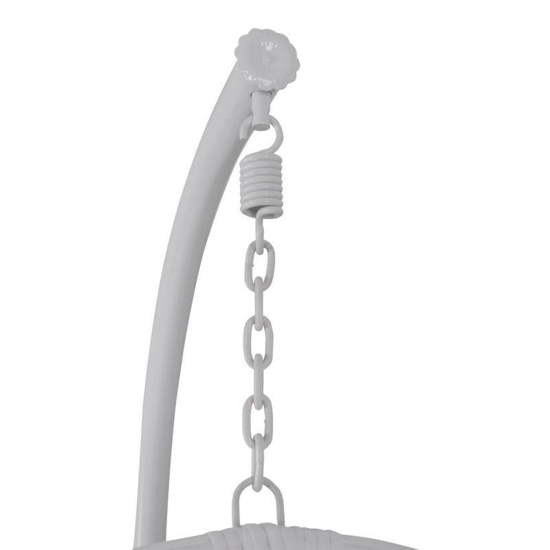 Metal frame hanging armchair with cushions and Wicker white knitting.