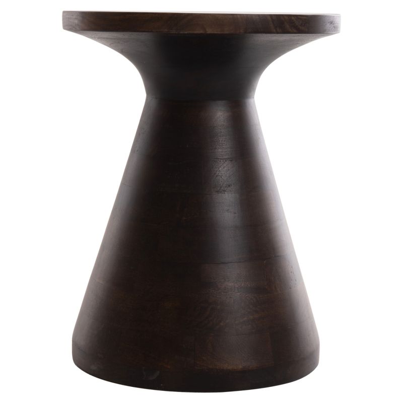 The “FOSS” round coffee table made entirely of solid mango wood in DARK BROWN looks like a stool, thanks to the conical shape of the base that ends in the round surface. A table that will impress with its shape and color.