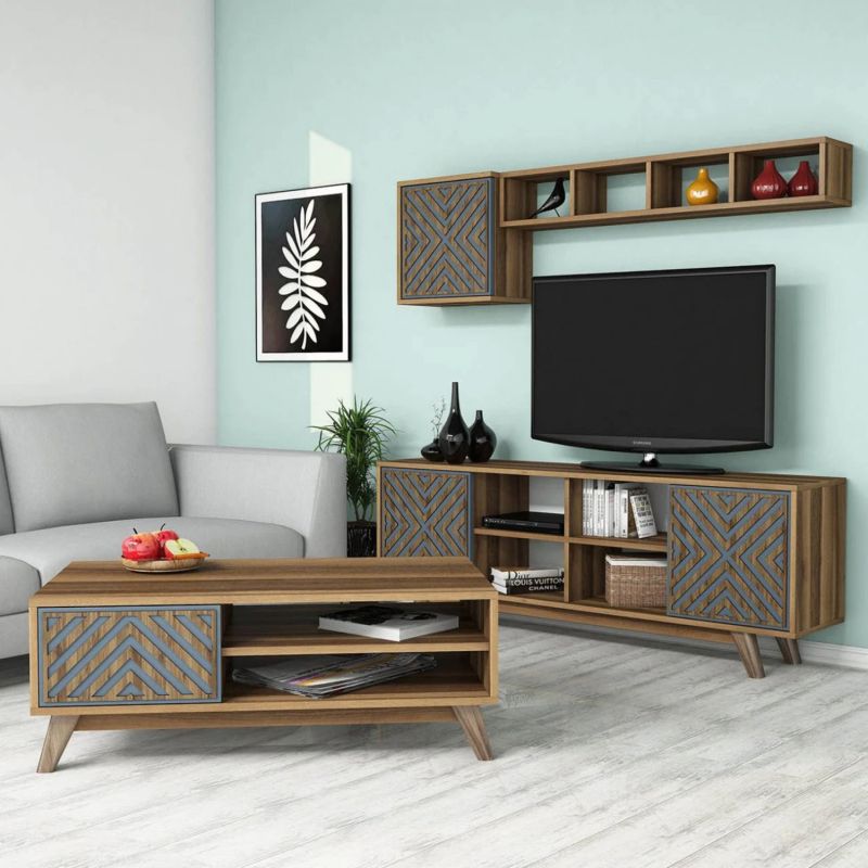 The composition ΗΜ11853.02 will change the look of your living room and offer you the upgrade you always wanted. It consists of a combination of furniture for your TV with a floor unit, wall shelf and wall cabinet, and a coffee table. The main feature of the whole set is the abundance of storage spaces. The entire composition is of the same series and the dominant colors are WALNUT and BLUE.
