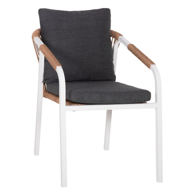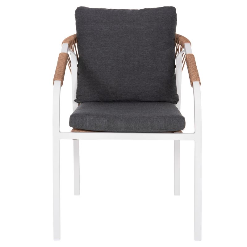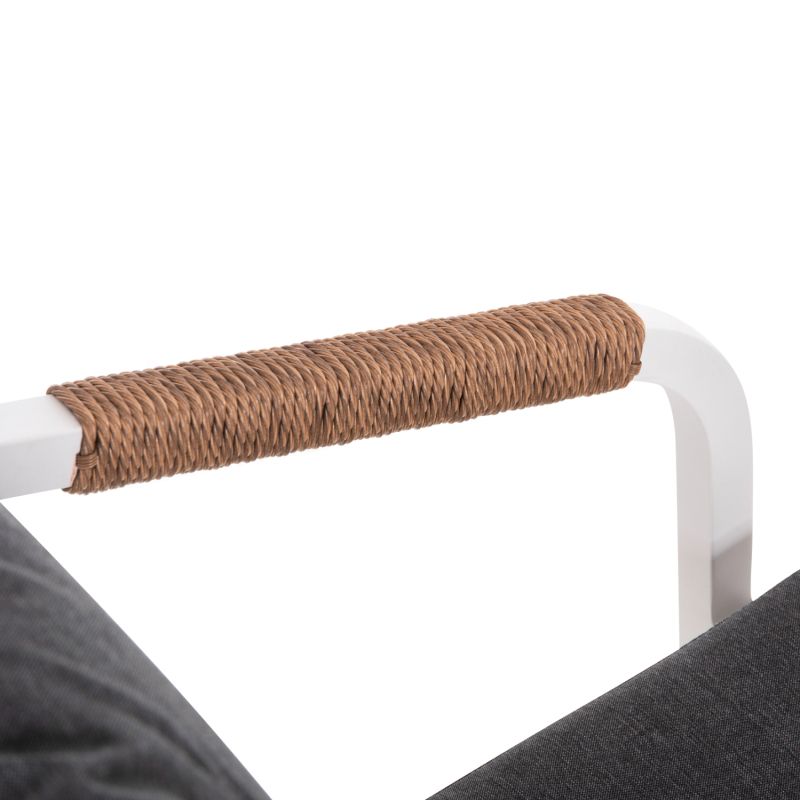 The MAERLY aluminum armchair in WHITE color is both for business use and for your home. Essentially it has no separate arms, but the backrest and arms are undivided hugging the body. This is a beautiful armchair with low backrest and seat made of twisted P.E. Rattan in LIGHT BROWN color. The special feature of this armchair is that it comes with comfortable cushions both on the seat and on the back in ANTHRACITE color.