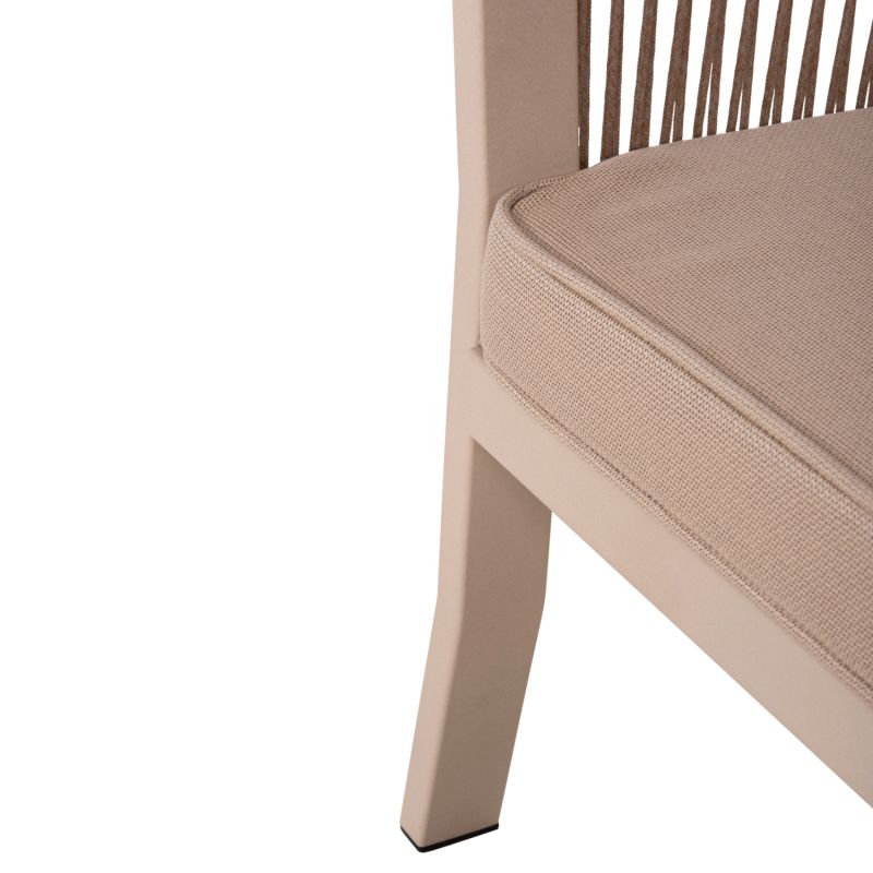 We present to you the impressive DRIMM outdoor dining set consisting of a large table and 6 armchairs. A set that you will love at first sight. The frame throughout the set is made of aluminum in BEIGE color covered with rope in CAPPUCCINO color. The beautiful table has an HPL tabletop in GREY MARBLE coloring. Their design is beautiful to look at while their sturdiness is obvious. The seat on the armchairs is wide while their back hugs the body which enhances the comfort they offer, combined with the comfortable cushions both on the seat and back. The cushions throughout the set are upholstered in quality fabric in CAPPUCCINO color and are filled with medium hardness foam materials for the greatest possible comfort, but also have zippers to remove the covers. What more could anyone ask for to upgrade their outdoor space?