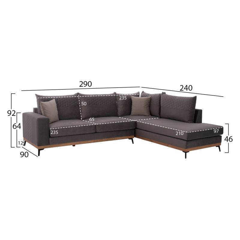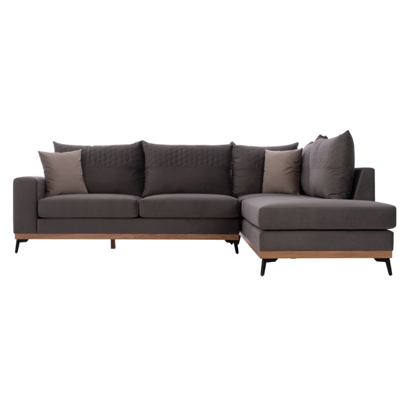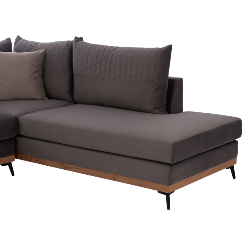Starting with the basics and the obvious, the color of the velvety upholstery of this large sofa is SAHARA 13- grey. It has 5 backrest cushions in the same color and two smaller decorative cushions in SAHARA 16- light gray. The 4 seat cushions combined with the backrest cushions give the perfect sense of comfort! The backrest cushions have a half-quilted style, and there is also a beautiful, quilted strip on the large arm. The pillows have a lighter gray color on their backside, while the color of the two small decorative pillows is even lighter. The large seat cushion that forms the corner of the sofa sports a Velcro patch underneath it, and sticks to the special surface of the corner stool’s frame. The piece that creates the right corner connects to the rest of the sofa harmoniously with reinforced galvanized panel hangers (vertical drawers) for enormous durability and ease of use.