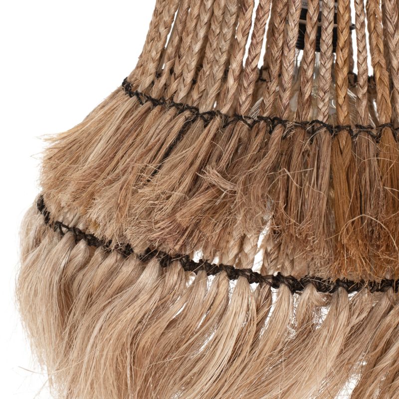 Hm7770- Ceiling pendant----If you want to decorate your space with a lamp in boho style, this is a suitable option. It is a single-light lamp with a bottleneck-shaped "cap" made of Manila hemp fibers in natural color. The special feature of this lamp is that in the upper part of the cap the fibers in the form of a rope giving another aesthetic to the lamp.