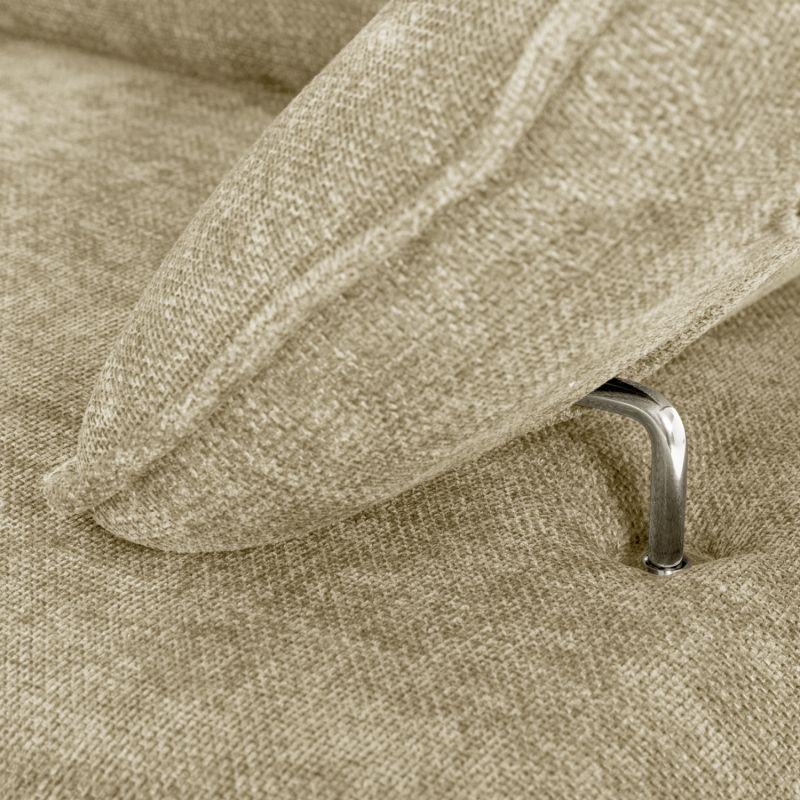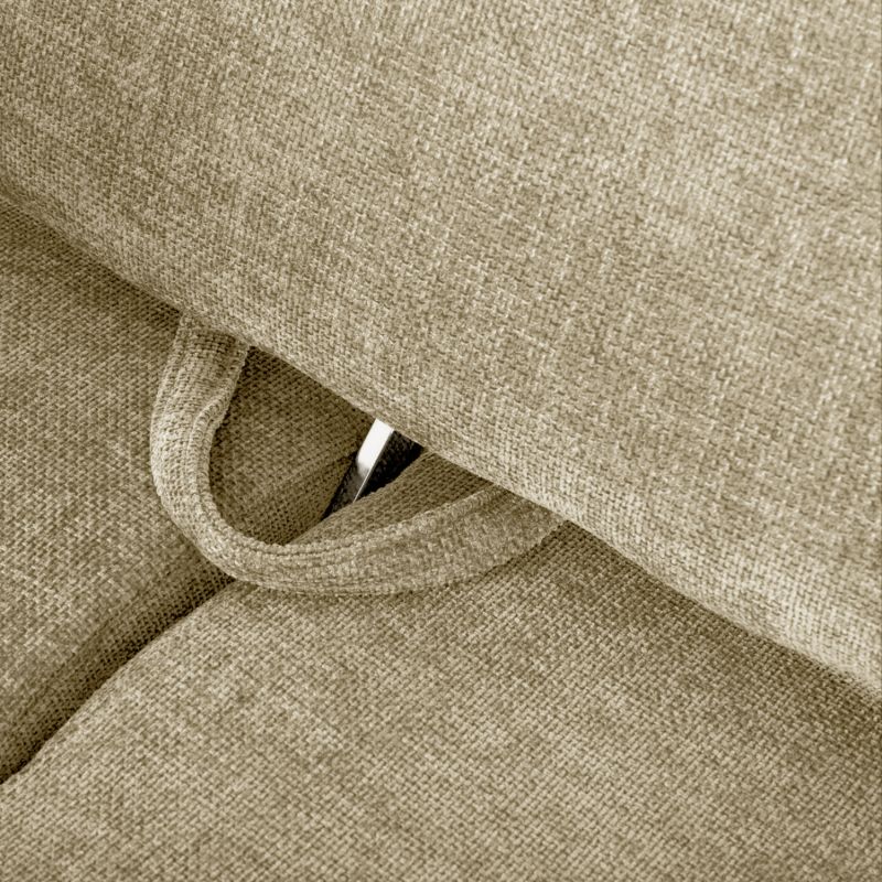 Introducing CONVERT, an amazing large sofa-bed in a LEFT corner configuration (as you look at it) upholstered in quality fabric in ECRU color. Its design steals the show and captivates the eye, thanks to its clean-cut "lines". The arms have the form of cushions but are part of the sofa and can be raised and lowered in 3 levels with a metal INOX mechanism. The backrest consists of 3 large square cushions which, like the arms, are moved with fabric handles and a metal mechanism backwards leaving enough space for a single bed. The piece that forms the corner has the same aesthetic and is connected to the main sofa with vertical panel hangers. The seat has medium hardness foam fillings combined with pocket springs, offering unparalleled comfort. Finally, the image is completed by the tall dark silver metal legs, as well as the 3 small decorative pillows.