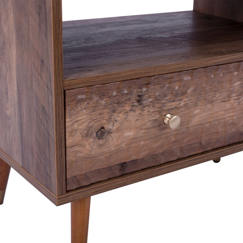 It has 3 drawers, and 2 storage spaces for electronic devices or decorations.