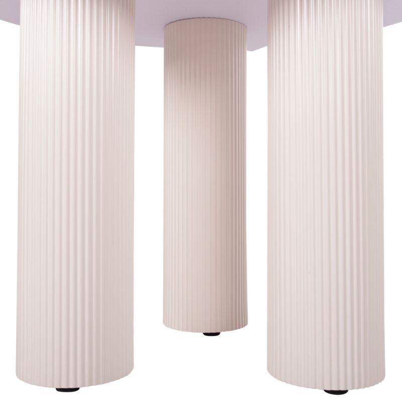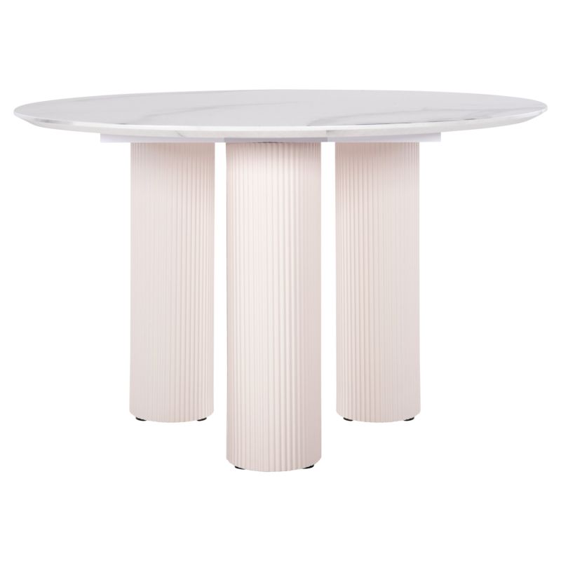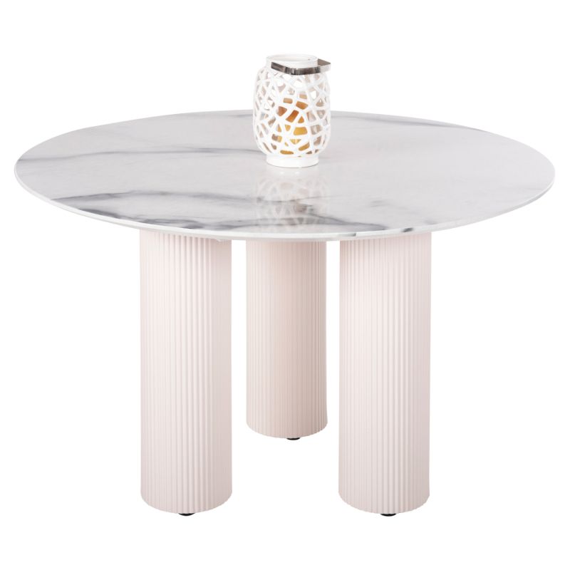 DORIK is a round table for the dining room, with an MDF tabletop in WHITE MARBLE color. The 3 column style legs are also WHITE. It is a beautiful table with satisfactory dimensions and particularly tasteful coloring, as a result of which it can fit aesthetically in almost any similar space.