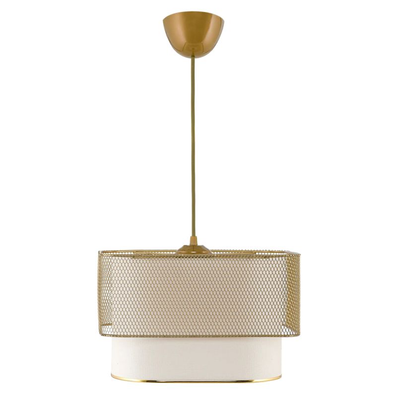 Ceiling Pendant-HM7660.02----We believe that lighting and lighting fixtures are the jewels of your home or business space. Just as a person wants to express himself through his jewelry, so we believe that a house or a business acquires its own personality through lighting, which naturally reflects the psychology and personality of its owner. That is why lighting is the element that can be easily changed in a home or a business, following the mood of its owner. The HM7660.02 with the WHITE fabric "cap" and the GOLD outer ring in the form of a grid in a rectangular shape with curved angles, offers your space an instant stylistic upgrade. The texture of the fabric gives the light an attractive glow, while the two-tone with the gold ring really gives the impression of luxury without limit.