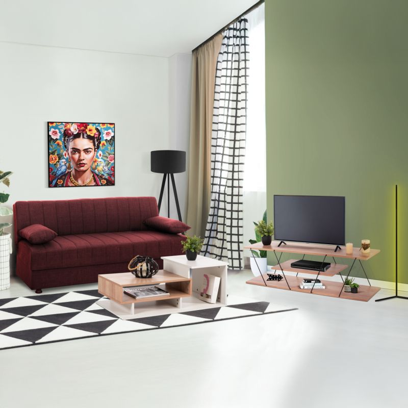 This set includes a sofa bed, coffee table, and a TV cabinet (stand).