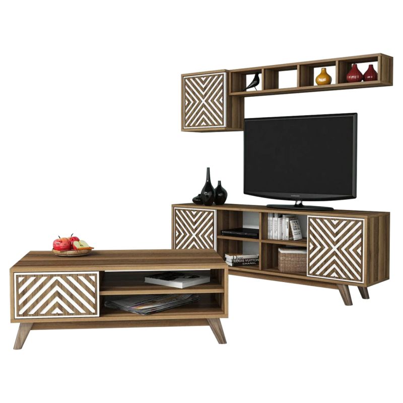 The composition ΗΜ11853.03 will change the look of your living room and offer you the upgrade you always wanted. It consists of a combination of furniture for your TV with a floor unit, wall shelf and wall cabinet, and a coffee table. The main feature of the whole set is the abundance of storage spaces. The entire composition is of the same series and the dominant colors are WALNUT and WHITE.