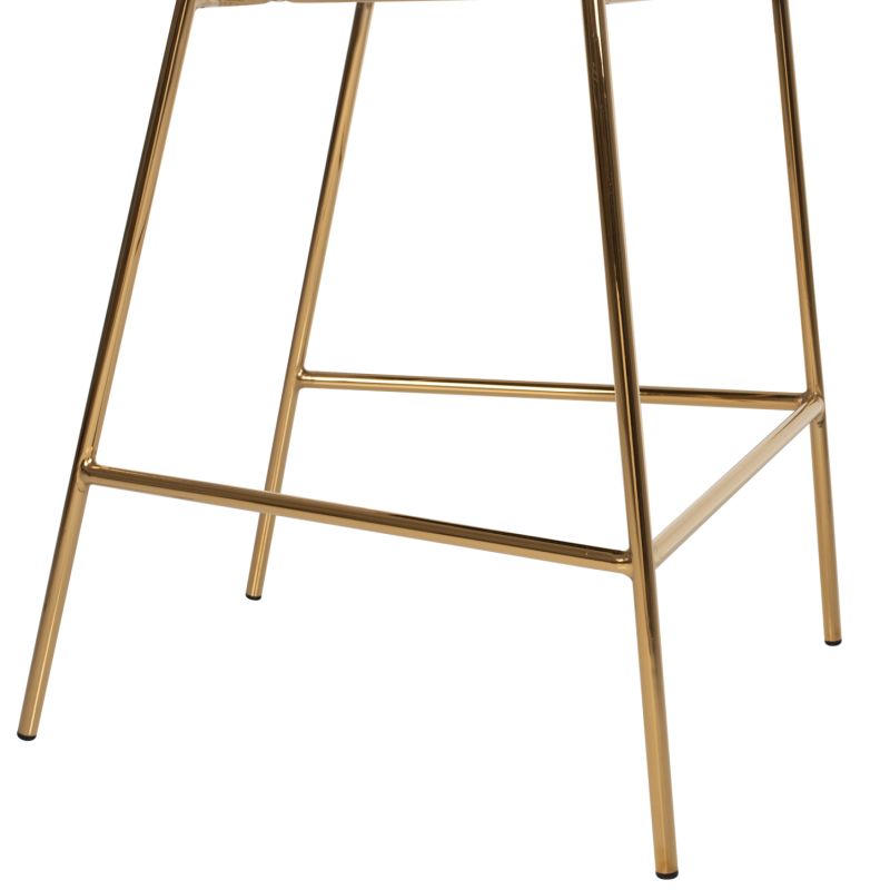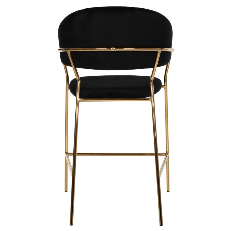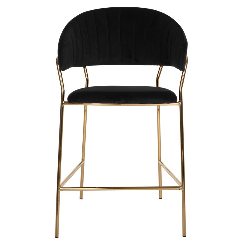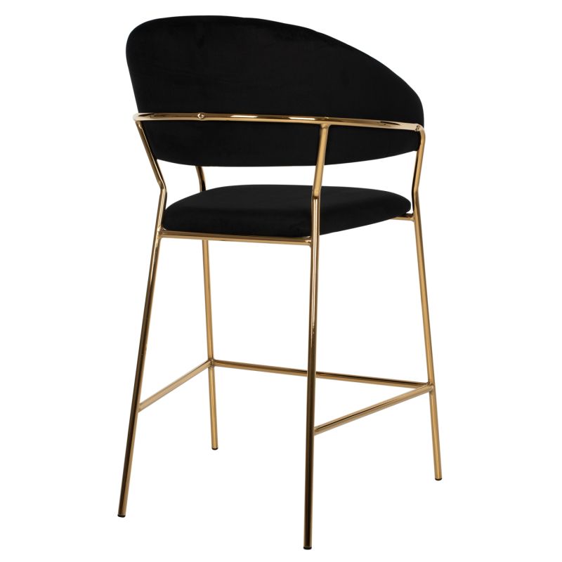Meet THEODORE. A BLACK velvet fabric bar stool, that has everything you would want from such a piece of furniture. THEODORE is simple, really quality, and elegant in appearance, and is sure to catch the eye. It is of medium height with a semi-circular back and the golden metal frame ends in 4 legs which are joined by a metal rod in front and on the sides. This rod serves as a "step" to rest the feet on, giving more comfort to the stool. The seat is comfortable, and this stool is sure to be the center of attention wherever it is placed.