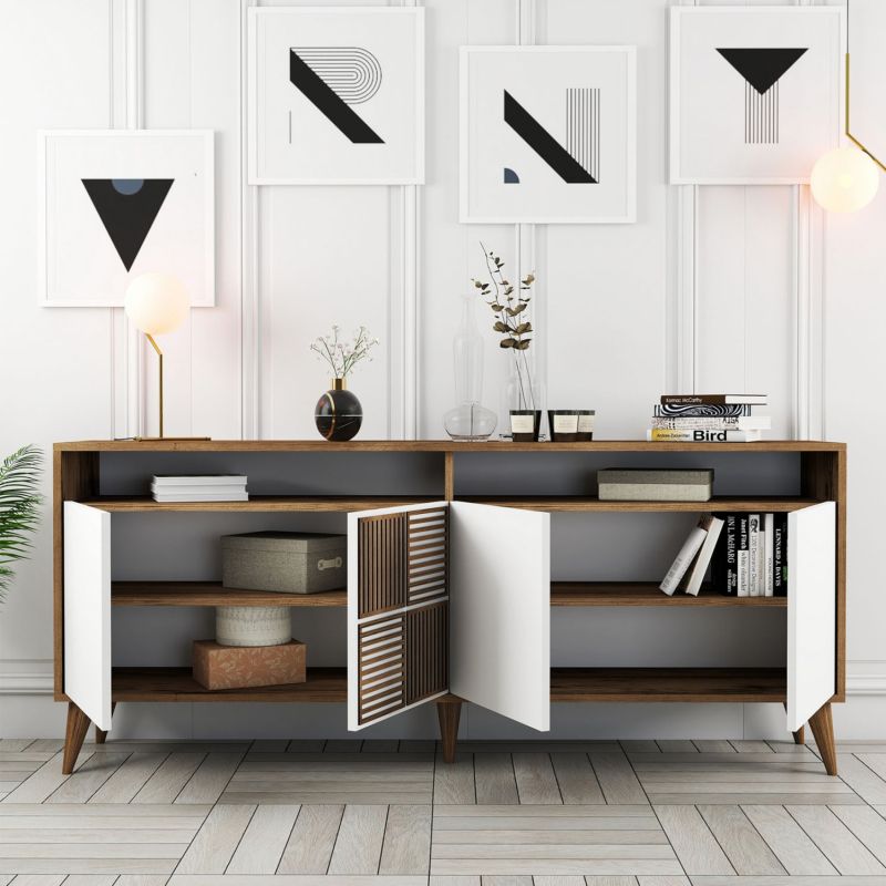 The HM9431.02 buffet is an imposing piece of furniture wherever you place it. It has tall and slanted legs in a walnut shade and two large cabinets with a shelf, which open with double doors. Directly above the cabinets and below the top surface is an open storage space. Its length ensures that its surface is large and sufficient for placing many objects. The color of the whole construction is walnut, while all the doors are WHITE. One door, in fact, has walnut details. This buffet will delight you! But what is a buffet? The sideboard is a highly practical piece of furniture, since in its storage areas we can put everything from crockery and glasses, to candles and various other useful items that we have at home, so that they are tidy and do not create clutter in the space.