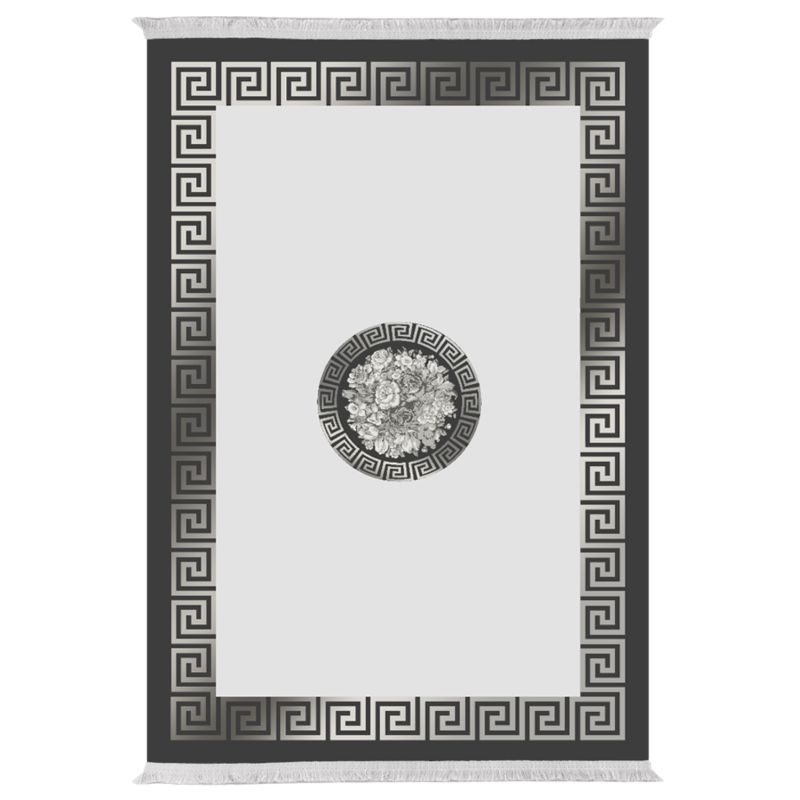 ΗΜ7675.35- LIVING ROOM CARPET -----We present to you the new addition to our product range. This rug has a BLACK-GREY background and symmetrical shapes of meanders on it. This sense of symmetry captures the eye and excites the imagination.