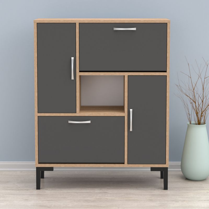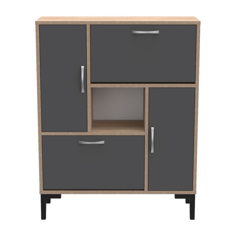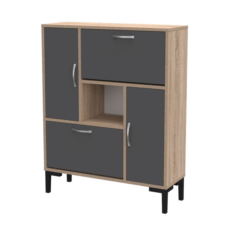 Do you like to be neat and clean? We present to you the beautiful MEDY melamine shoe rack in two-tone ANTHRACITE-SONAMA with black high legs. It has 2 shoe storage spaces, 2 vertical storage compartments, and a square open space in the center. Our purpose is to help you organize and improve the functionality of your home in the best possible way.