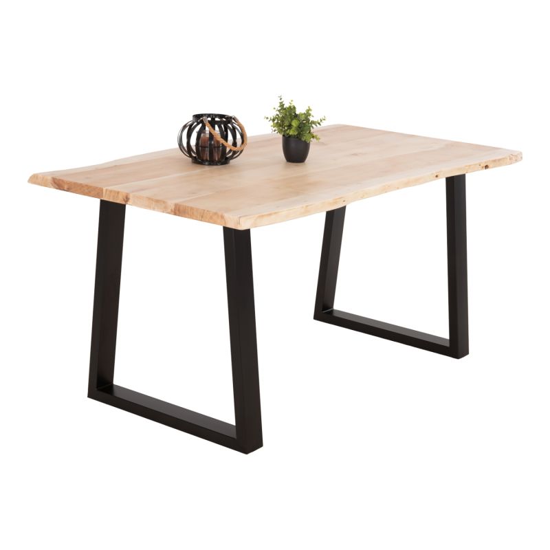 Discover the unique handmade table MONTANA with natural solid ACACIA wood tabletop in NATURAL color. The shape is rectangular and rests on two black metal bases with a trapezoidal shape. The modern design meets nature and gives a timeless and warm feeling to your space.