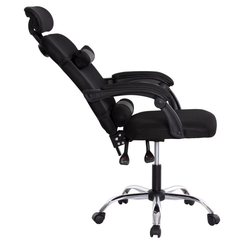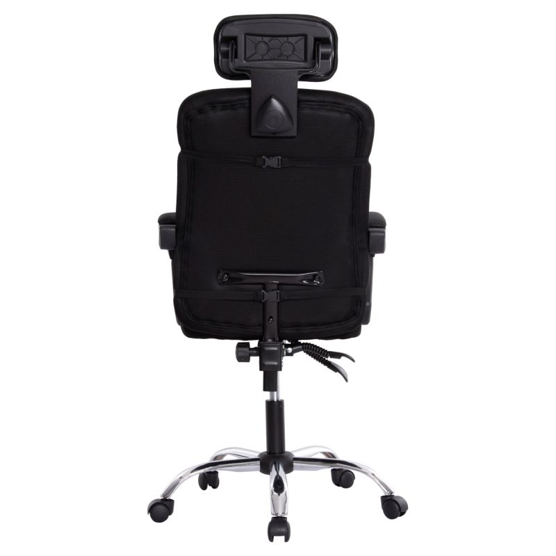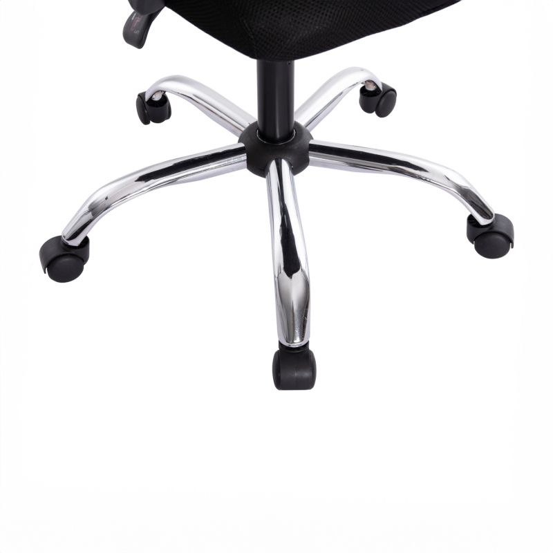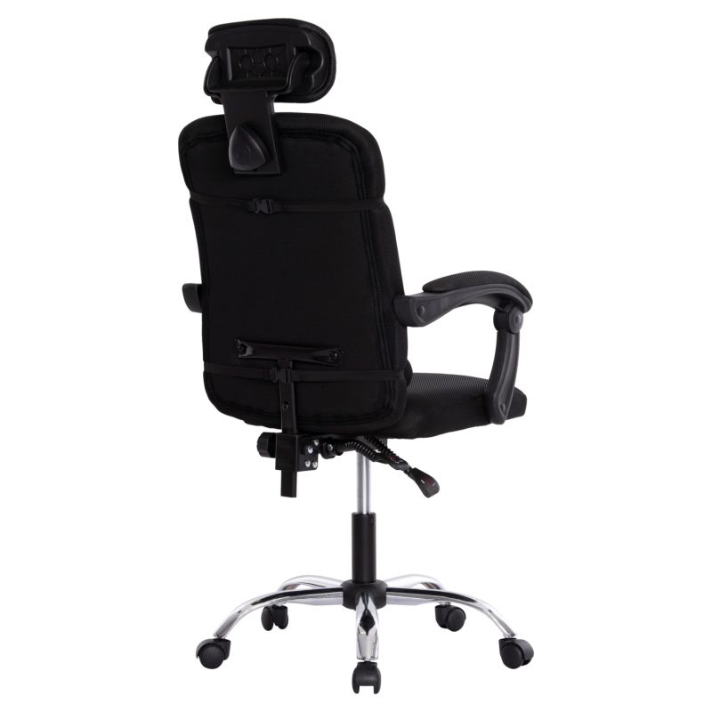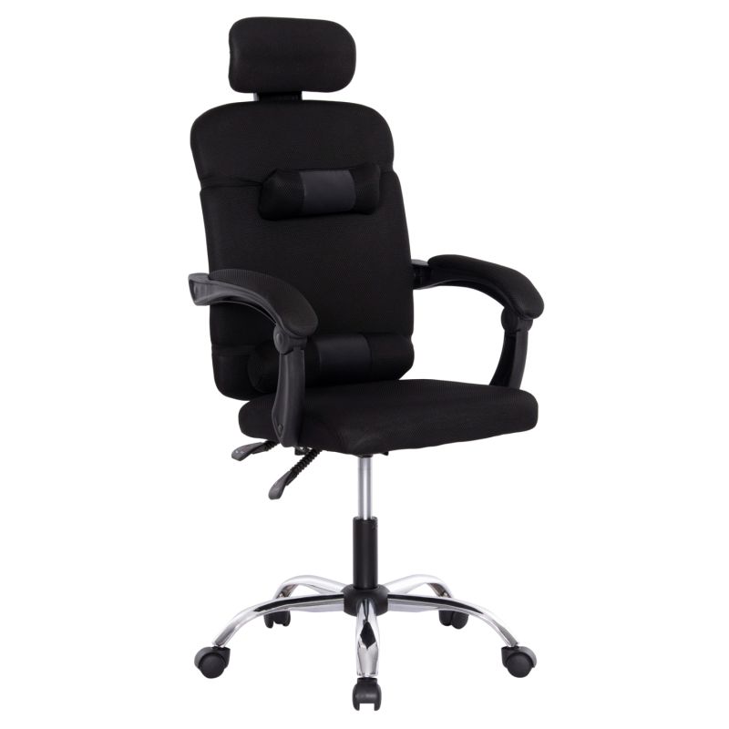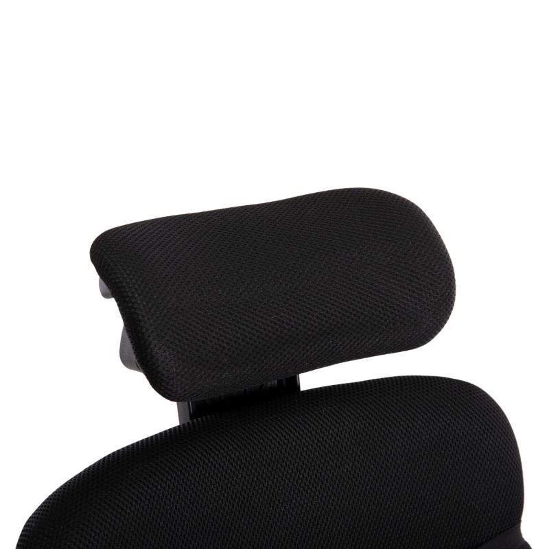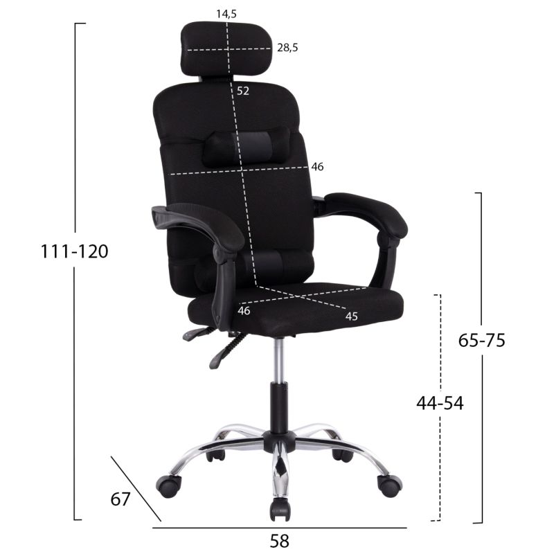 The CRONER office chair in BLACK color with a chrome metal base, has a high anatomical back with mesh fabric, a comfortable seat with mesh fabric, 2 adjustable waist and lumbar cushions, as well as arms made of nylon material with mesh fabric lining. The suspension has height and recline adjustment mechanisms. What makes it stand out, however, is the fact that it has an independent headrest with a separate nylon frame and mesh fabric lining.