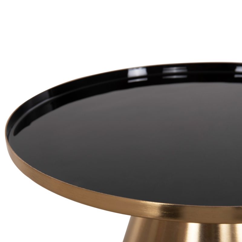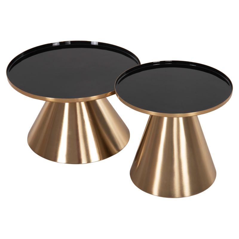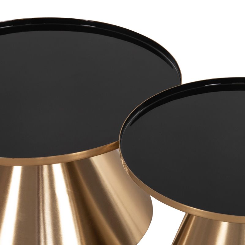 The LORME side table set of 2 is one of the new additions to our range. These are 2 round metal tables with conical bases. Their color is gold while the tabletops are black. The outstanding feature of these tables is the glossy surfaces that give a sense of purity and luxury to your living room. Ideal for both home and business premises.