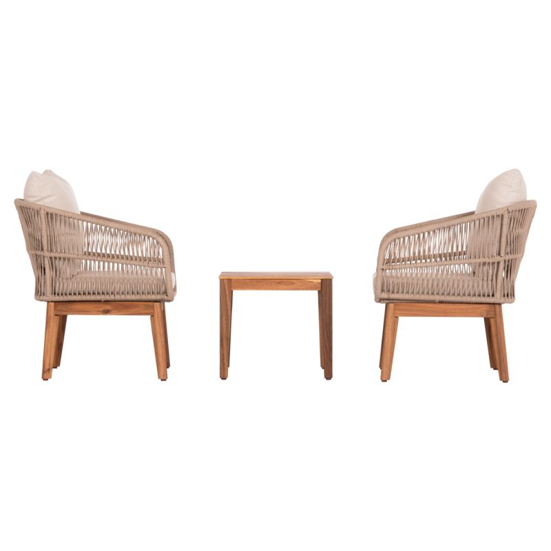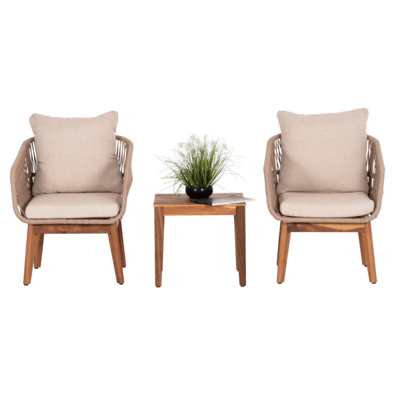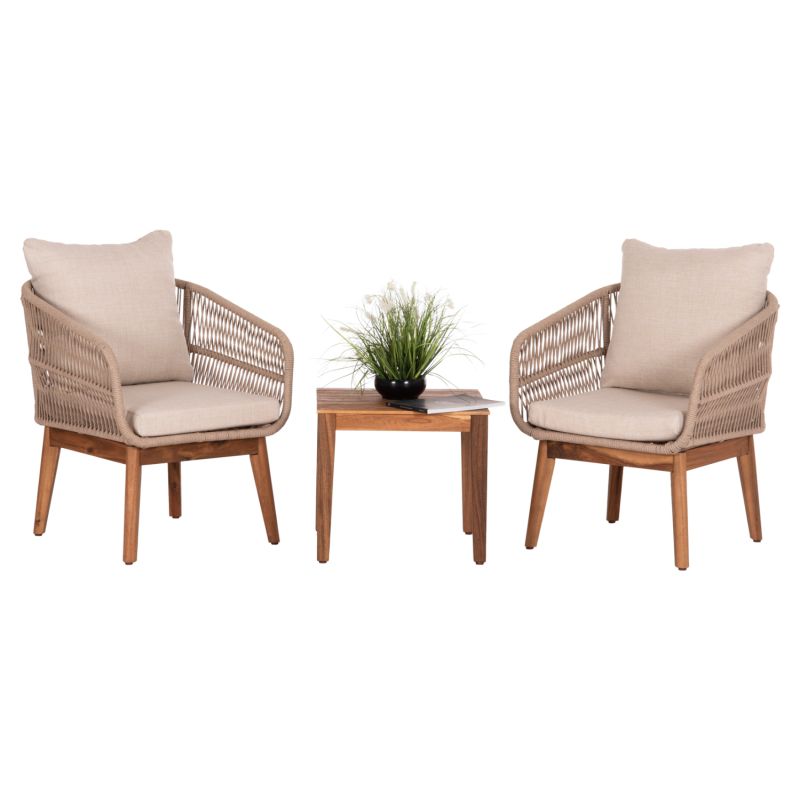 OUTDOOR LOUNGE SET 3PCS RUTH HM6229 ACACIA WOOD--ROPE-METAL FRAME-CUSHIONS IN BEIGE