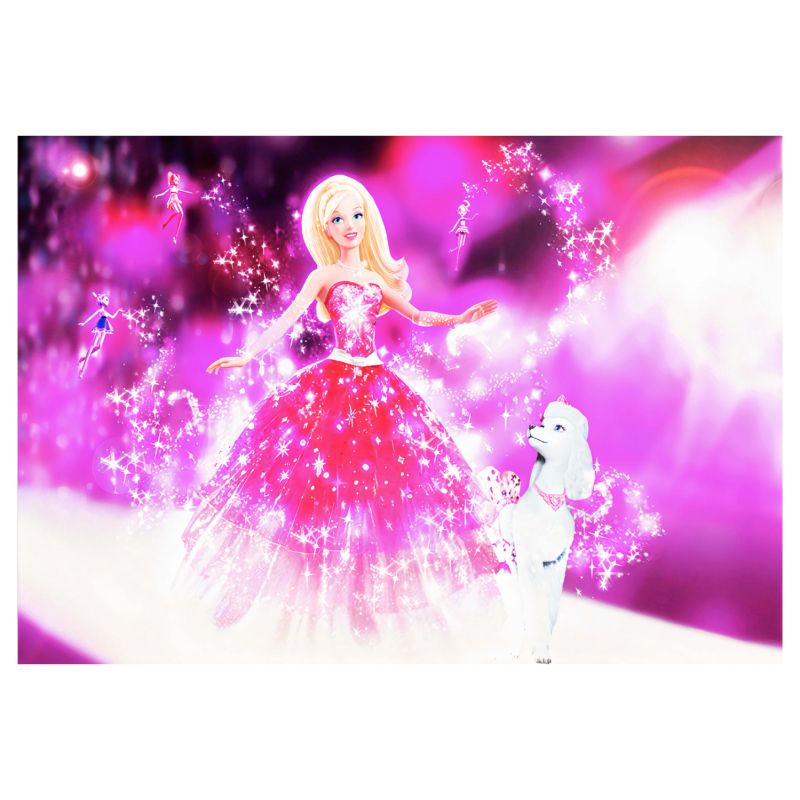 Това ефектно килимче за момичета е с доминиращ РОЗОВ цвят и е без бордюр. Целият килим е красиво изображение на популярната руса кукла с нейното бяло куче, сияеща в розовата си блестяща рокля, "окъпана" в "звезден прах". В крайна сметка какво друго му трябва на едно дете, за да задвижи въображението си?