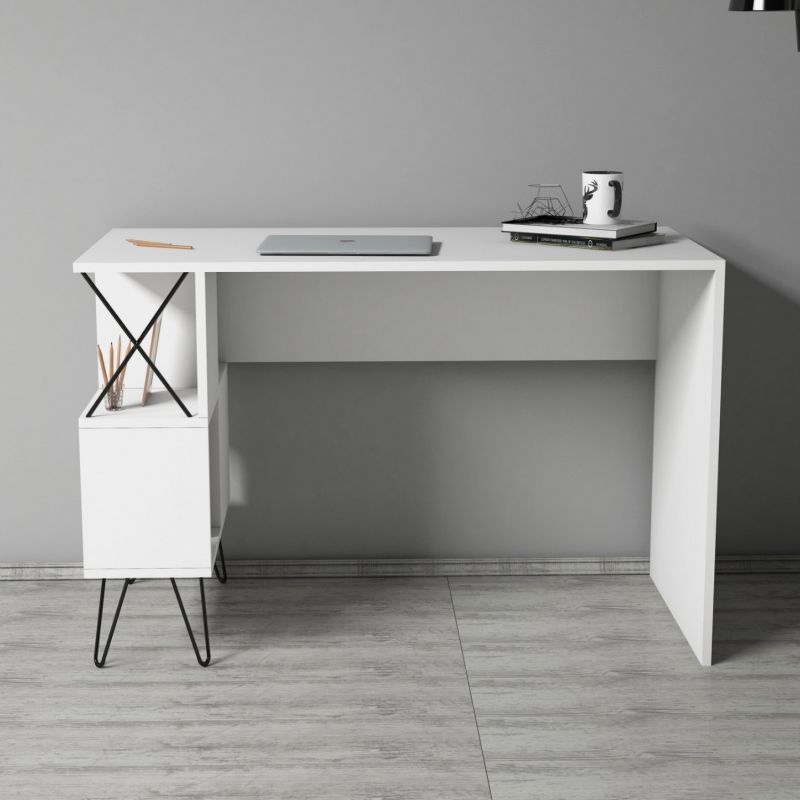 Студията DESK HΜ9509.03 е качествено предложение, предимно за домашния офис. ИЗЦЯЛО БЯЛИЯТ цвят прави мебелите доминиращи в пространството. Отличната и практична конструкция гарантира, че ще се наслаждавате на всичките си работни часове, които знаем, че са много! Все пак бюрото е най-елементарната мебел в стаята и трябва да го избирате внимателно. HΜ9509.03 има 4 отворени пространства за поставяне на обекти във формата на кубчета от лявата страна и разбира се повърхност с добър размер. Дизайнът е модерен, като краката от лявата страна са метални в черен цвят, докато дясната страна се поддържа от меламинов панел.