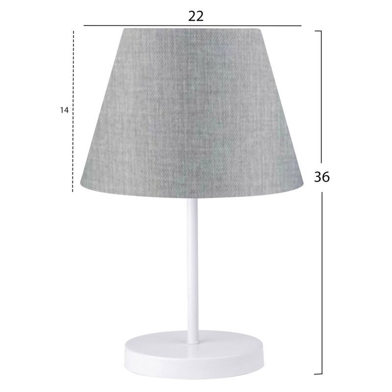 Модерна настолна лампа с кръгла основа и колона в бял цвят и светлосива трапецовидна капачка от плат. Това е декоративна лампа, в семпла и непретенциозна линия. Светлината се разпръсква във вашето пространство приятно и сладко за почивка на очите. Този тип осветителни тела не са предназначени за четене и това винаги трябва да се има предвид при избора им. Те са чисто декоративни и съчетаването им с околната среда трябва да е хармонично. Тази лампа е елегантна и удобна като размери, предоставяща безброй възможности за "завързване" с останалата част от вашата декорация. Това е едно малко произведение на изкуството.
