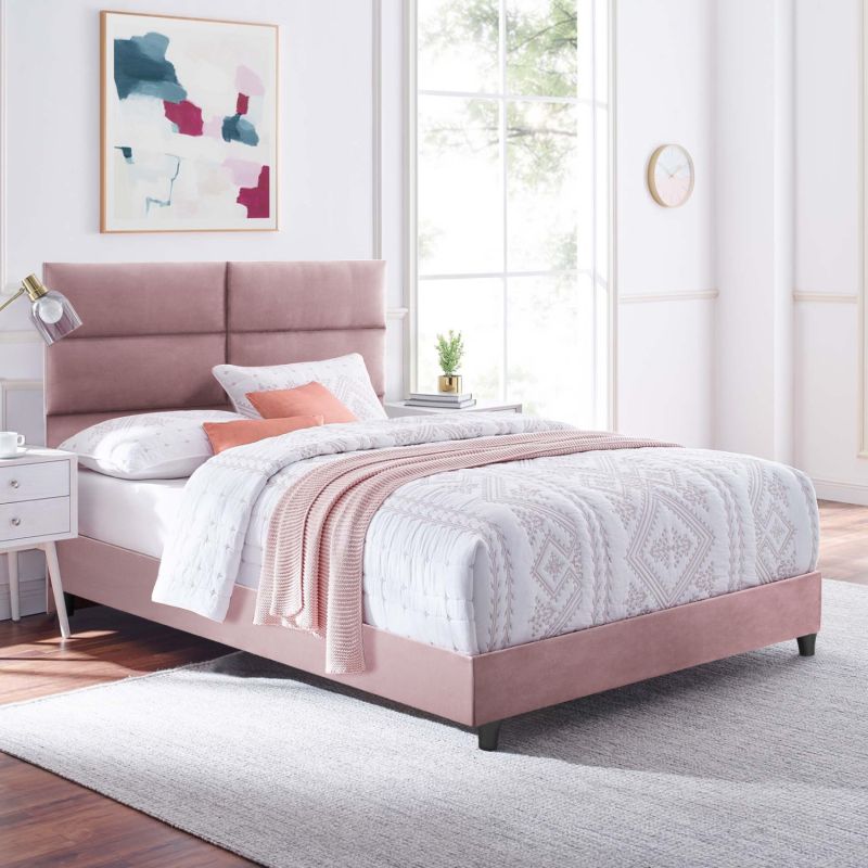 Таблата е висока и тапицирана с ватирана шарка от големи правоъгълници, докато цялото легло е тапицирано с кадифен плат. Цвят DUSTY PINK в цялото легло е впечатляващ и може да се комбинира с различни декоративни шарки. Но основната характеристика на това легло е, че не следва класическата конструкция с ламелни ламели за опора на матрака, а се състои от непрекъсната повърхност от 2 ПДЧ плоскости, върху които лежи матракът! В матрак с размери 120x200 см всяка мечта ще се побере!