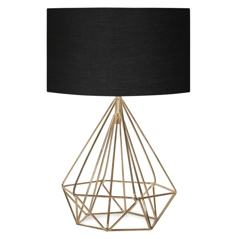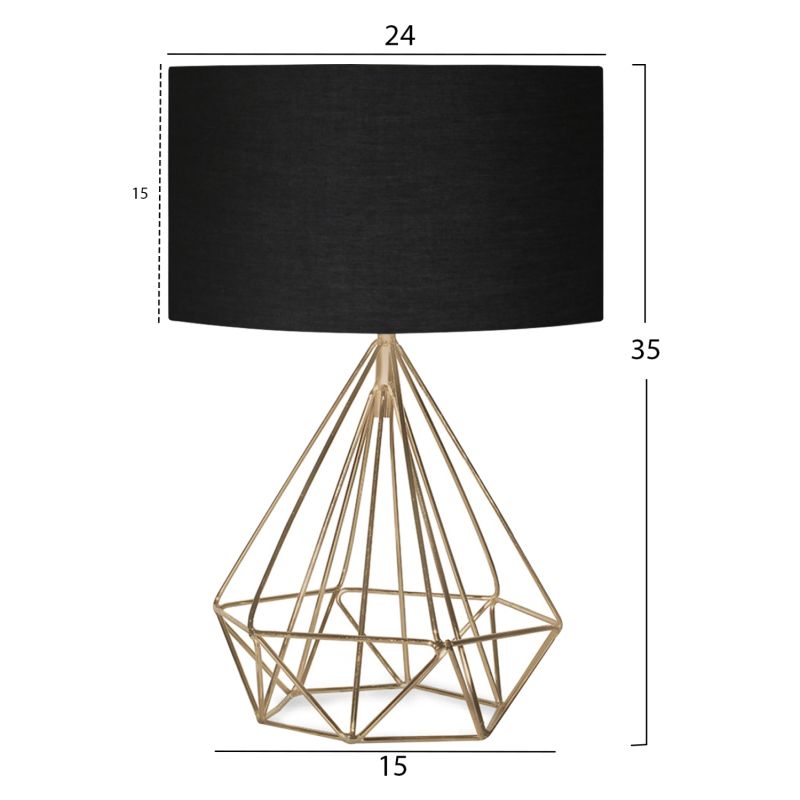 Основата и колоната са заели своето място красиво в златиста метална мрежа във формата на многоъгълна пирамида и на върха й се намира черният цилиндричен абажур, създавайки комплект, който е въплъщение на модерния интериорен дизайн.