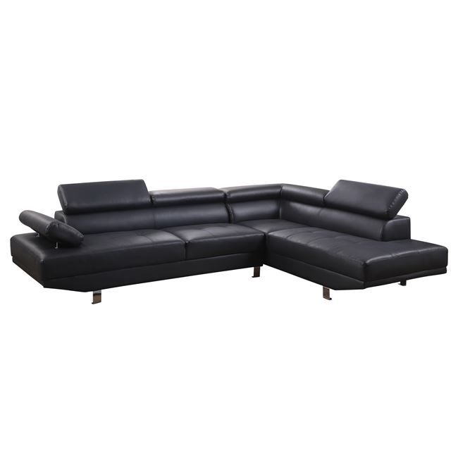 Десният ъглов диван е с покритие от черна PU кожа в модерен дизайн.