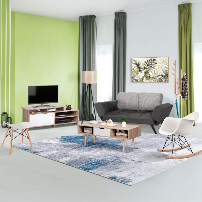 Този комплект включва разтегателен диван, поставка за телевизор, люлеещ се стол, масичка за кафе, стояща на пода закачалка, табуретка!