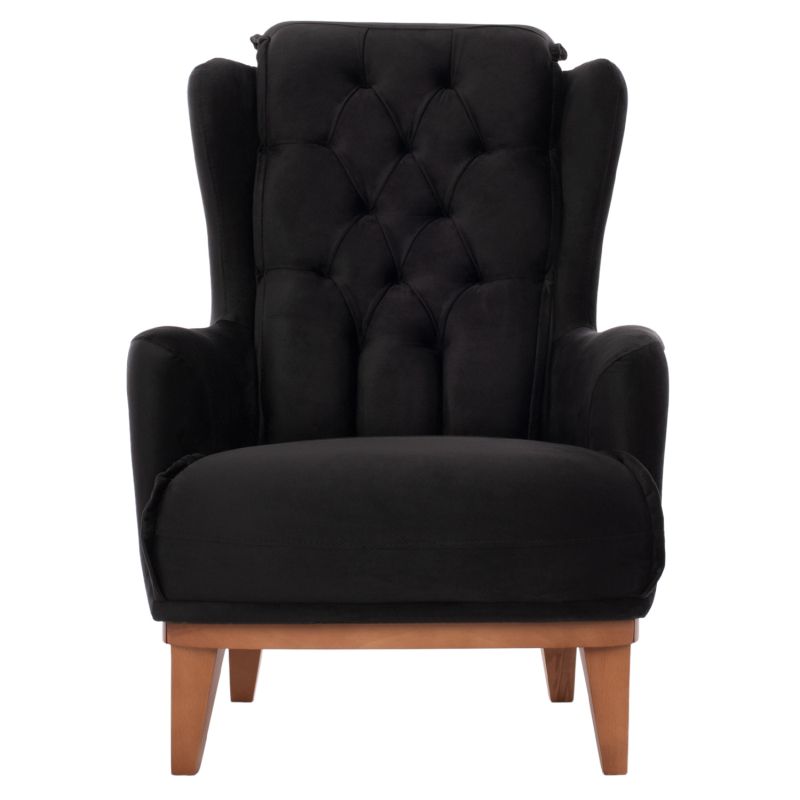 Представяме ви кресло BENNINGTON Bergere, в ЧЕРЕН цвят с дървени крака в естествен нюанс. Подплатата на гърба е изработена с капитонираща техника, която придава особена красота на бергера в комбинация, разбира се, с кадифето, което е материята на подплатата.
