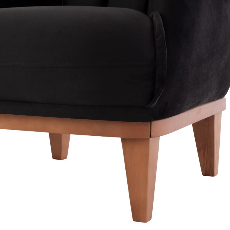 Но не само цветът и капитонът правят това бергере да се откроява. Краката са високи, като точно над краката има дървена рамка, която минава по цялата дължина на бергера, в естествен дървесен цвят, създавайки красив двуцветен цвят с ЧЕРНОТО на тапицерията.