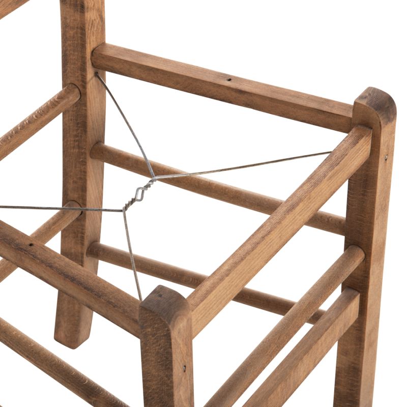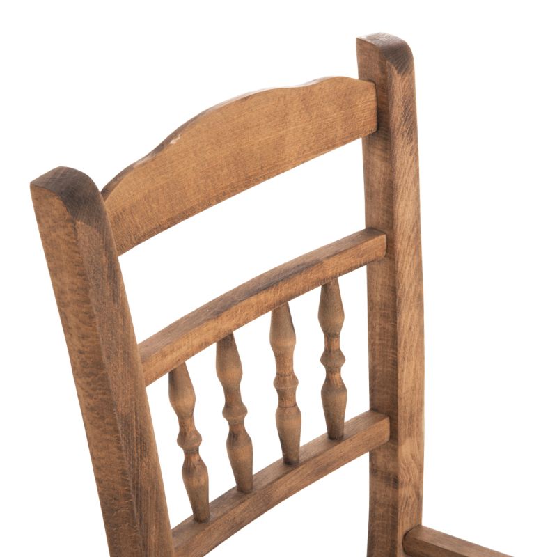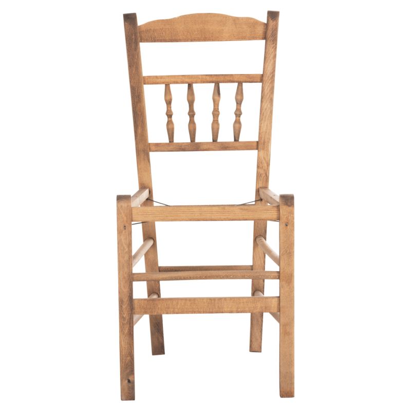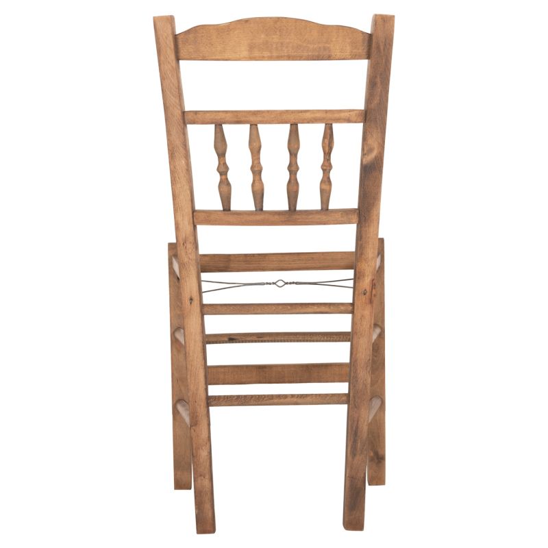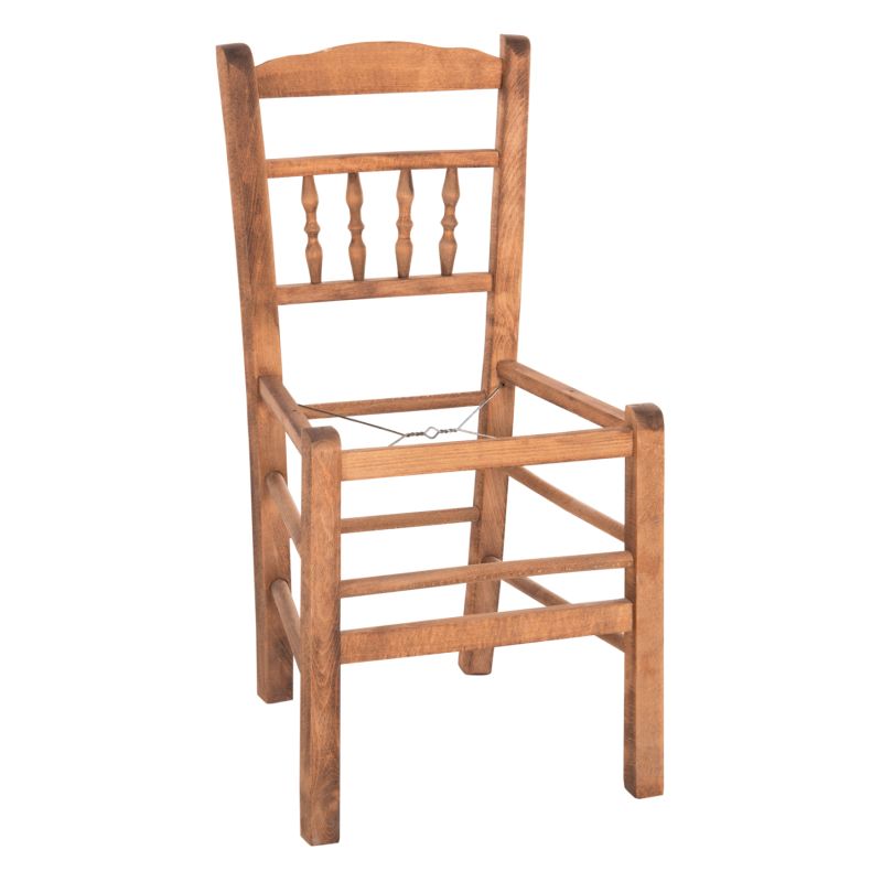 Стол “CHOSEN” за професионална употреба е традиционен стол, изработен от бук в цвят ОРЕХ. Облегалката е с вертикални дървени резбовани релси и е естетически подходяща за механа, кафене, но и като цяло за декорирани пространства в класическия гръцки традиционен стил. Доставя се само рамката, която е «вързана» с тел за по-голяма здравина и издръжливост във времето.