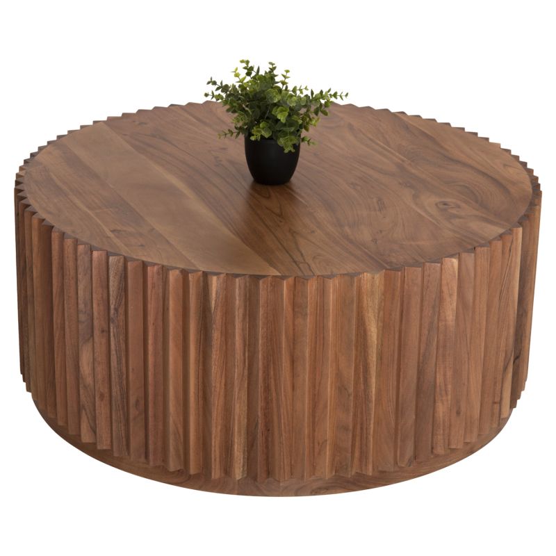 SEDGE е кръгла холна маса в естествен дървесен цвят. Масата е цилиндрично масивно парче от качествена дървесина с красиви гънки. Това е ниска маса със сравнително голяма повърхност, която ще ви задоволи максимално.