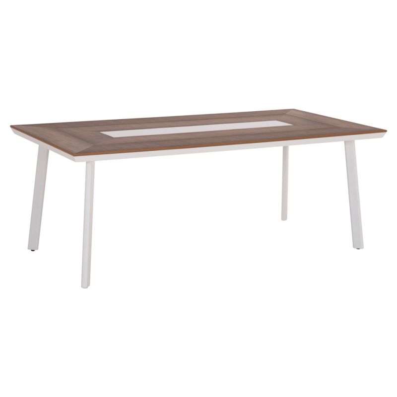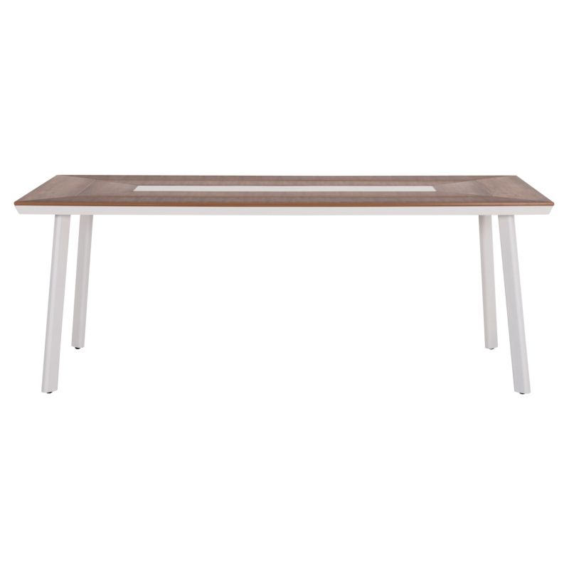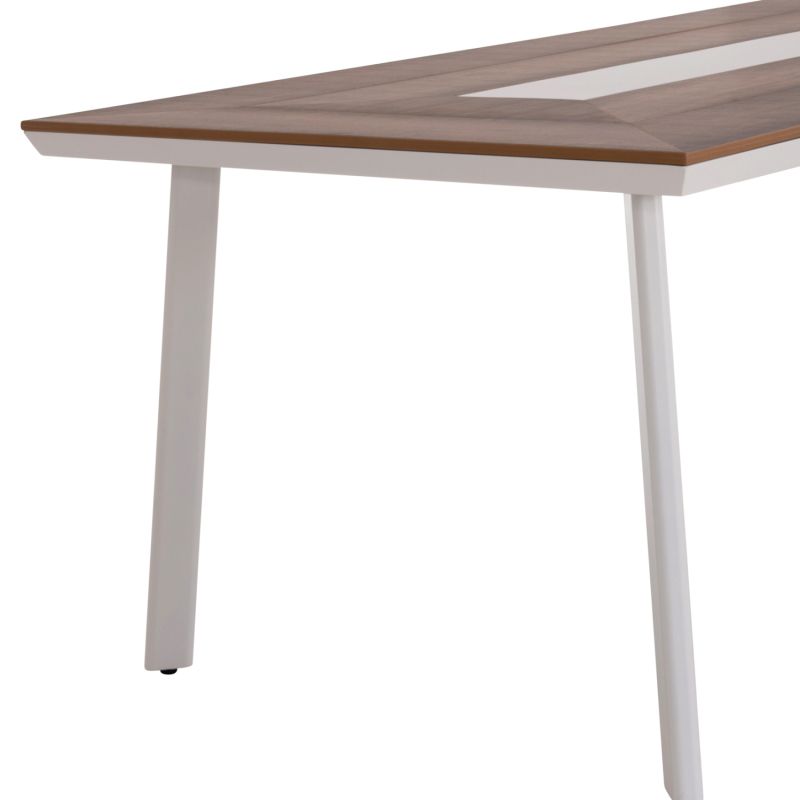 Масата с плот от полидър е от 100% рециклирана пластмасова дървесина, алуминиева рамка в бял цвят.