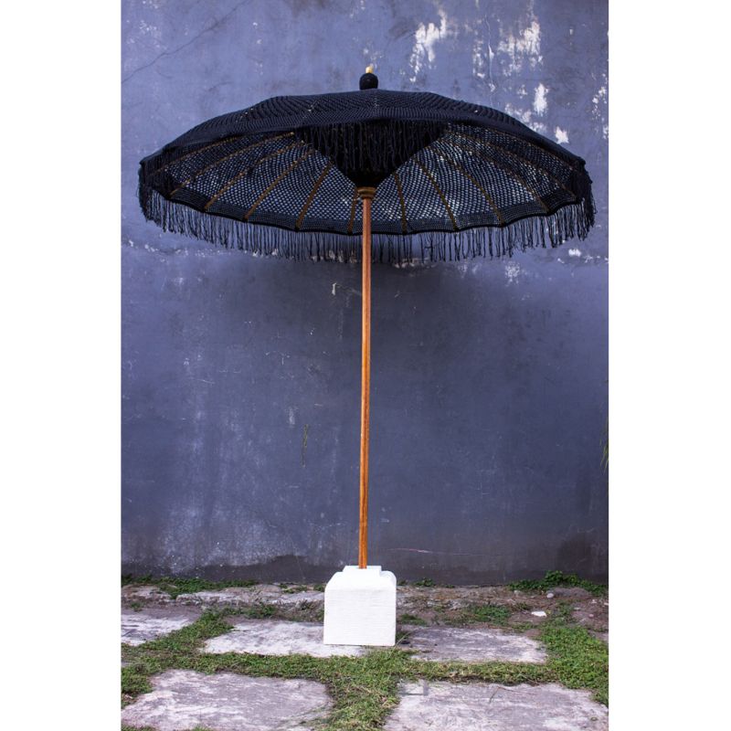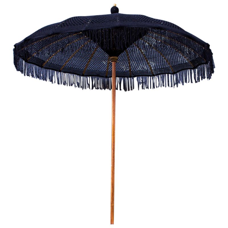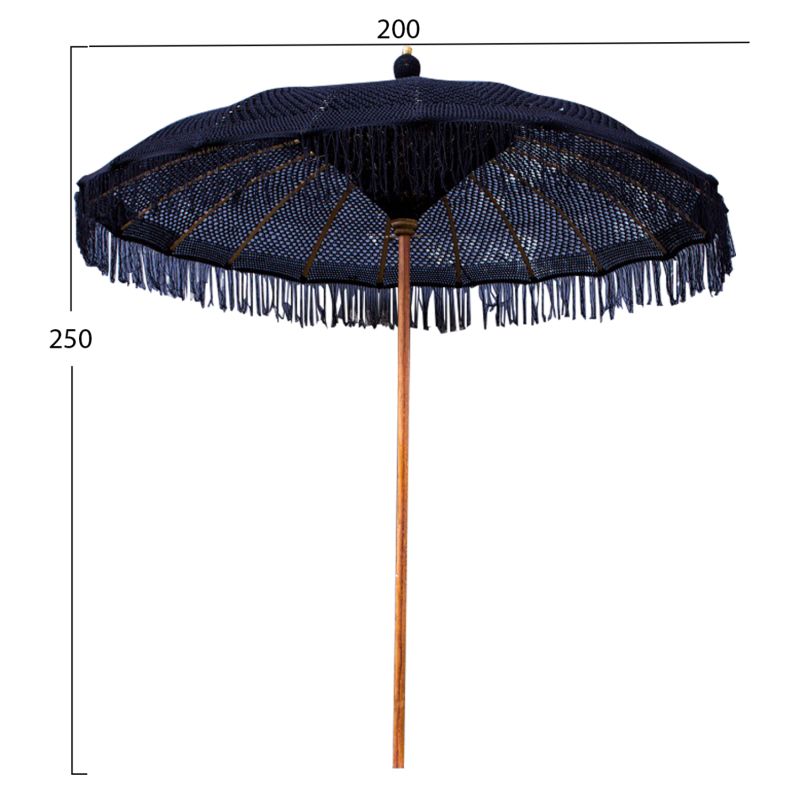 Луксозният чадър ΗΜ6035.03 е наистина красив. Прътът му е изработен от масивно тиково дърво, докато "ребрата" на чадъра са от БАМБУК. Особеното обаче на този невероятен чадър е, че сенникът му е изработен от макраме в ЧЕРЕН цвят. Чадър, който може да се използва по много начини, особено в професионални пространства, и със своите размери предлага засенчване със... стил!