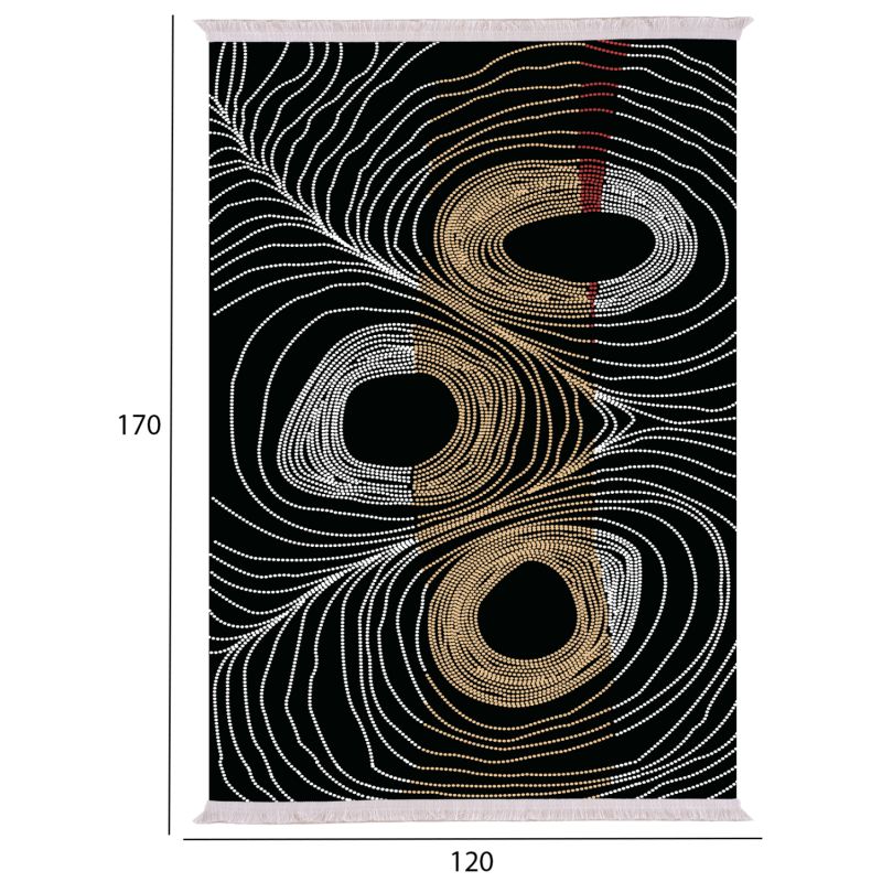 Този конкретен килим е модерен от какъвто и „ъгъл“ да го погледнете. Има доминиращи цветове сиво и златно на изцяло черен фон по цялата повърхност на килима. Неговата отличителна черта са 3 неправилни кръга, които могат да се тълкуват както всеки го възприема. Ето защо той дава усещането за движение в пространството и разбира се ще предизвика интерес с особения детайл и странната асиметрия на линиите си. Определено ще обнови естетически хола ви.
