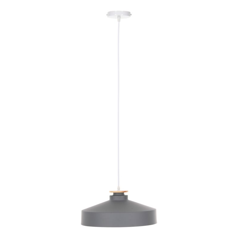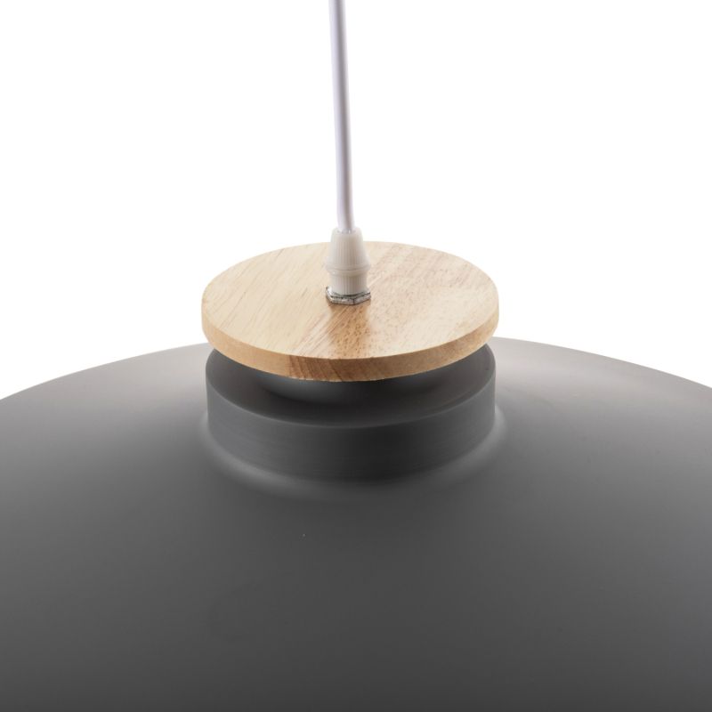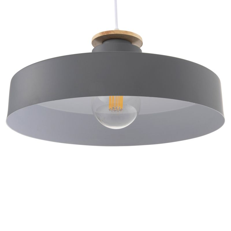 Открийте нашата нова висяща таванна лампа и завършете декорацията си. Това е лампа със СИВА плитка метална капачка във формата на камбана с дървени детайли в горната част на лампата. Естетически, той е завършен с бял висящ кабел и бяла таванна основа и е най-новата тенденция при плафониери.