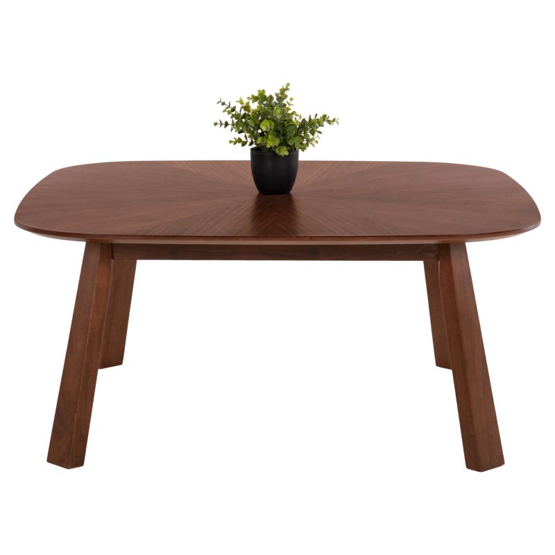 Холна маса RINER ще Ви изненада със своя стил и практичност. Това е квадратна маса със заоблени ъгли с особеност, че нюансът на скосения плот и 4-те крака е ТЪМЕН ОРЕХ в стил слънчеви лъчи.