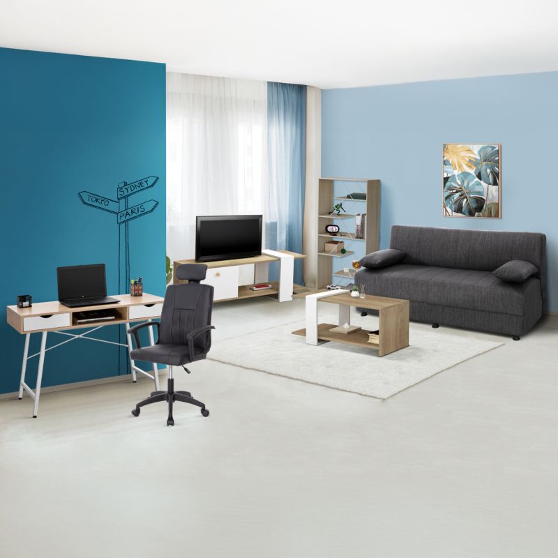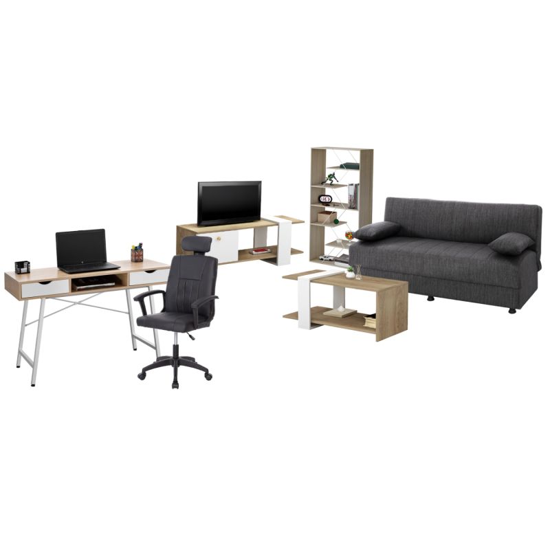 Този комплект включва разтегателен диван, поставка за телевизор, библиотека, холна маса, бюро, офис стол!